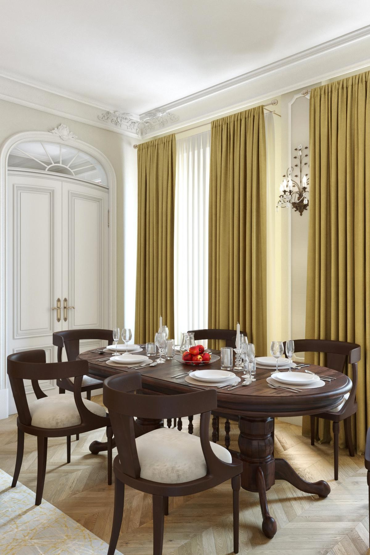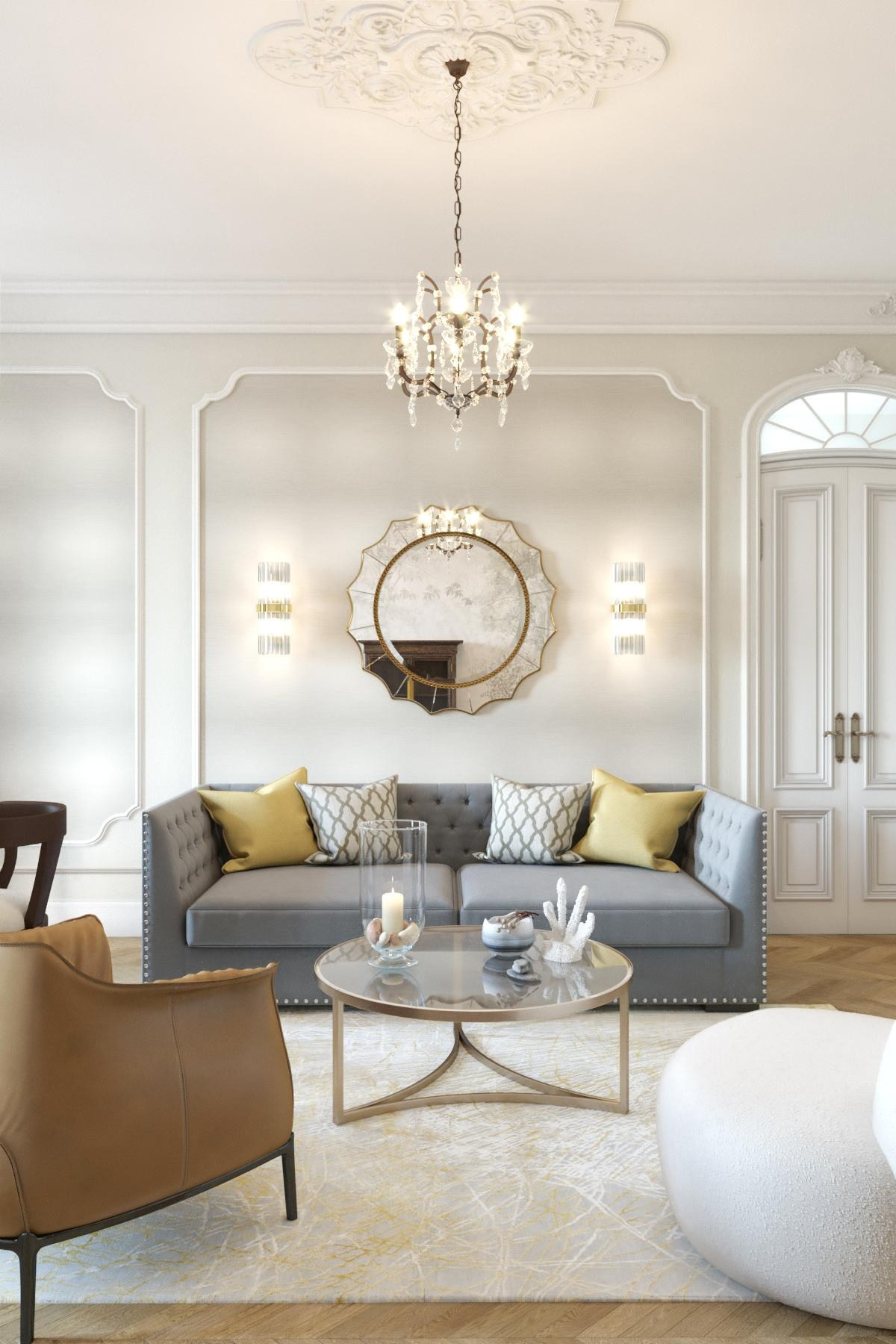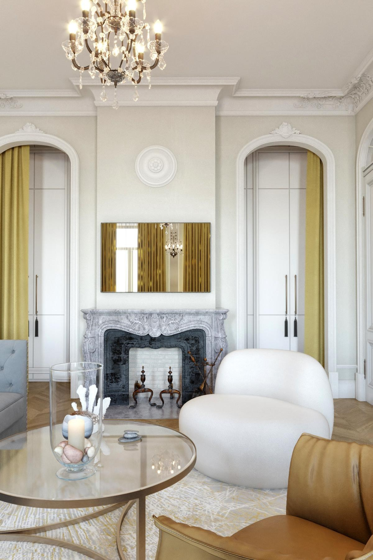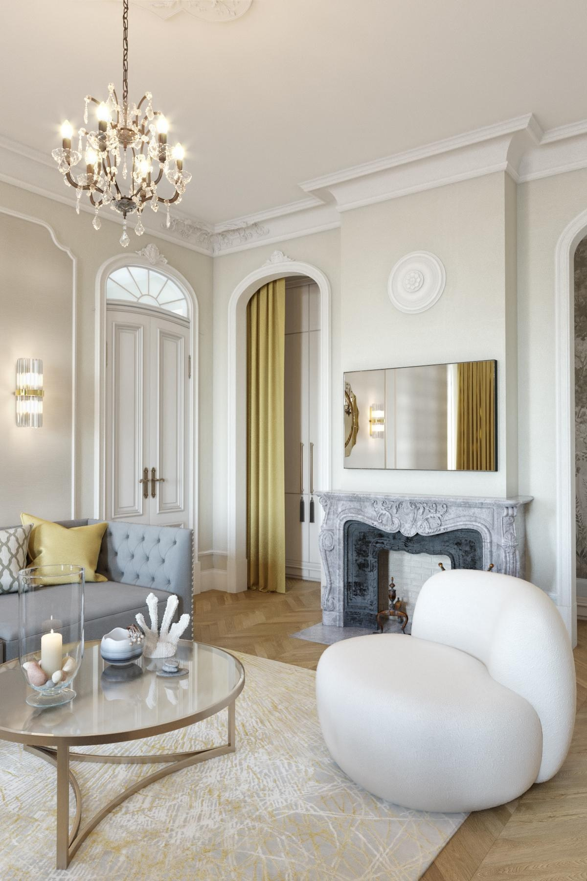 Квартира с историей в центре Петербурга, на Большой Конюшенной улице, в доме, где жил композитор Н. А. Римский-Корсаков. Её интерьер-современная интерпретация классического стиля: лепнина и резной мрамор камина соседствуют с современной мебелью. Для комфорта проживания была пересмотрена коридорная планировка помещений, и коридор стал скрытым в нише гардеробом. Это позволило расположить камин в центре гостиной-столовой и включить элементы арок, полюбившиеся заказчице в дверные порталы и проходы.