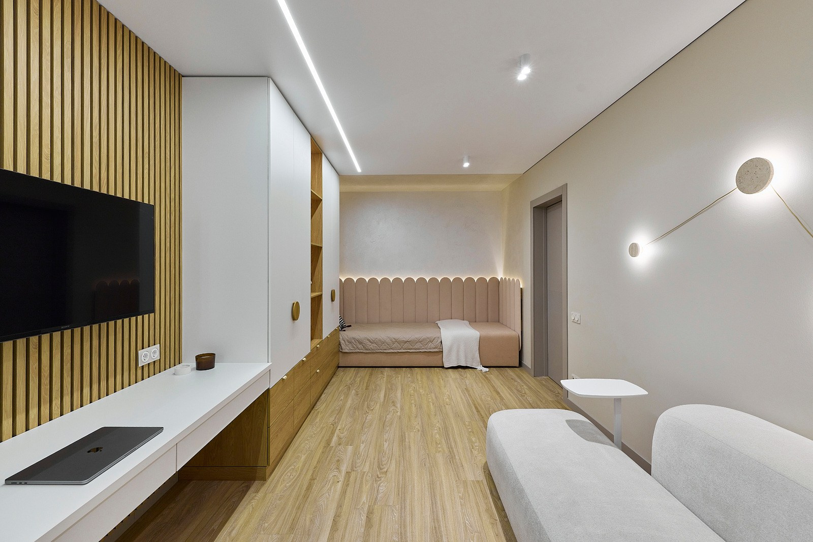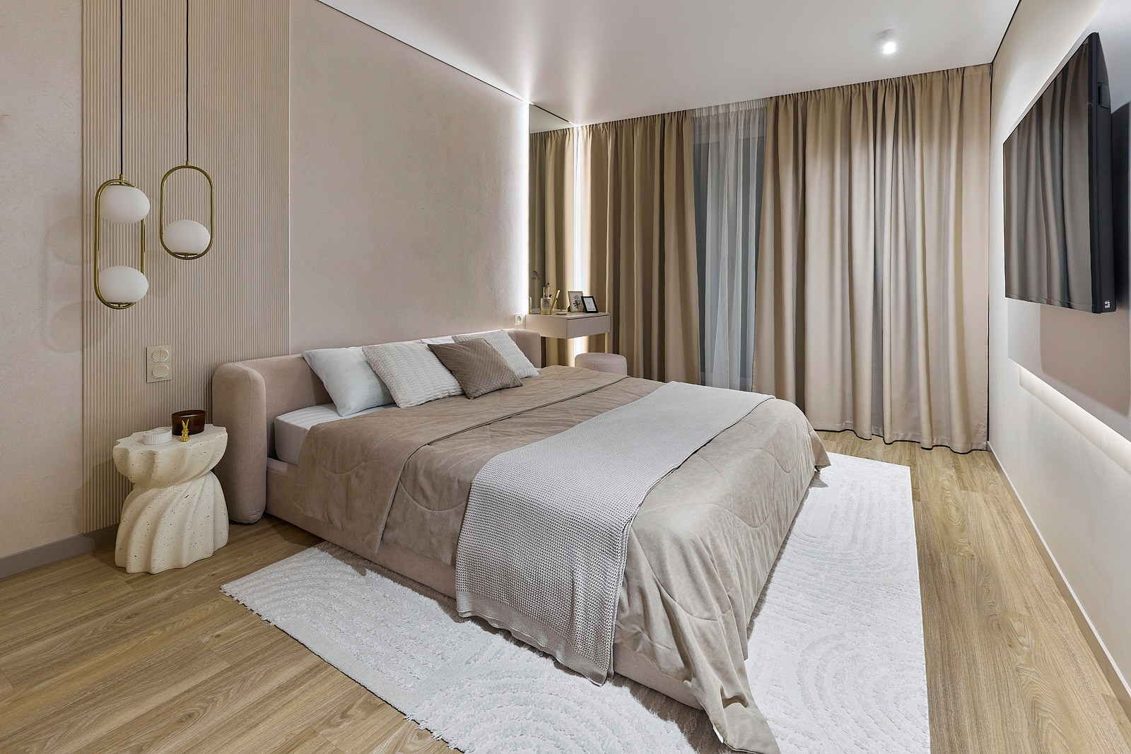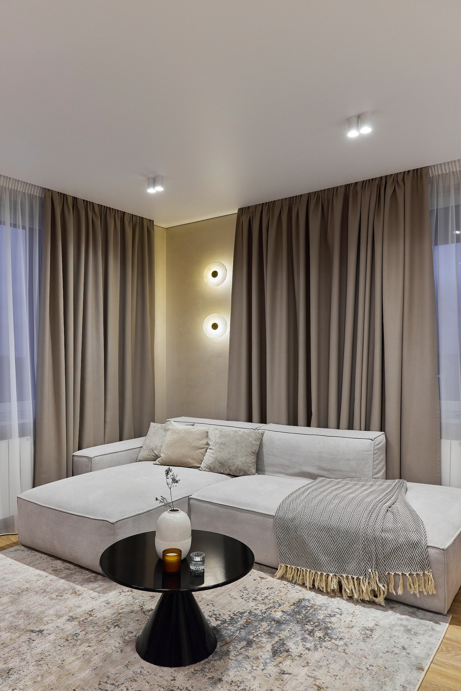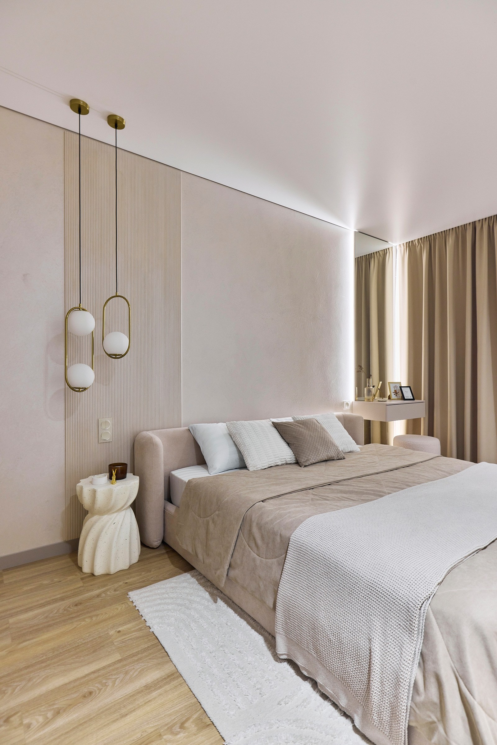 Монохромный интерьер с песчаными оттенками, спокойный и мягкий. Заказчица любит песчаные оттенки, природность цвета и плавность линий, спокойный и монохромный интерьер. Муж — рыбак и прислал фотографии реки, как того образа, который его вдохновляет. Я взял за основу образ песчаного берега, реки, каменного и землистого русла — идея течения дает образ смягченных форм, плавности, но при этом внутренней силы. Декор с морской тематикой, образы ракушки в керамике и панно, все детали отсылают к теме реки.