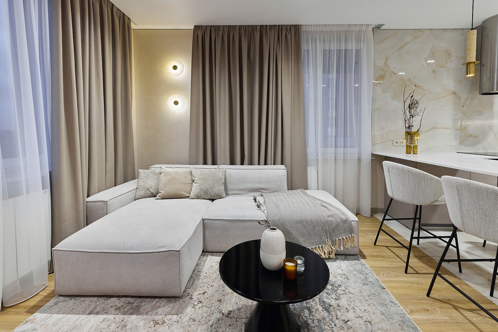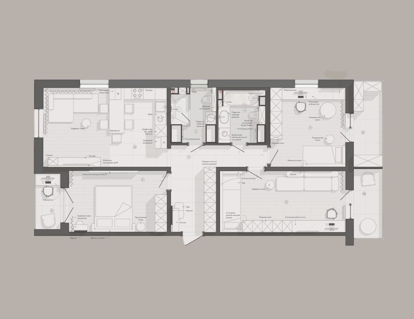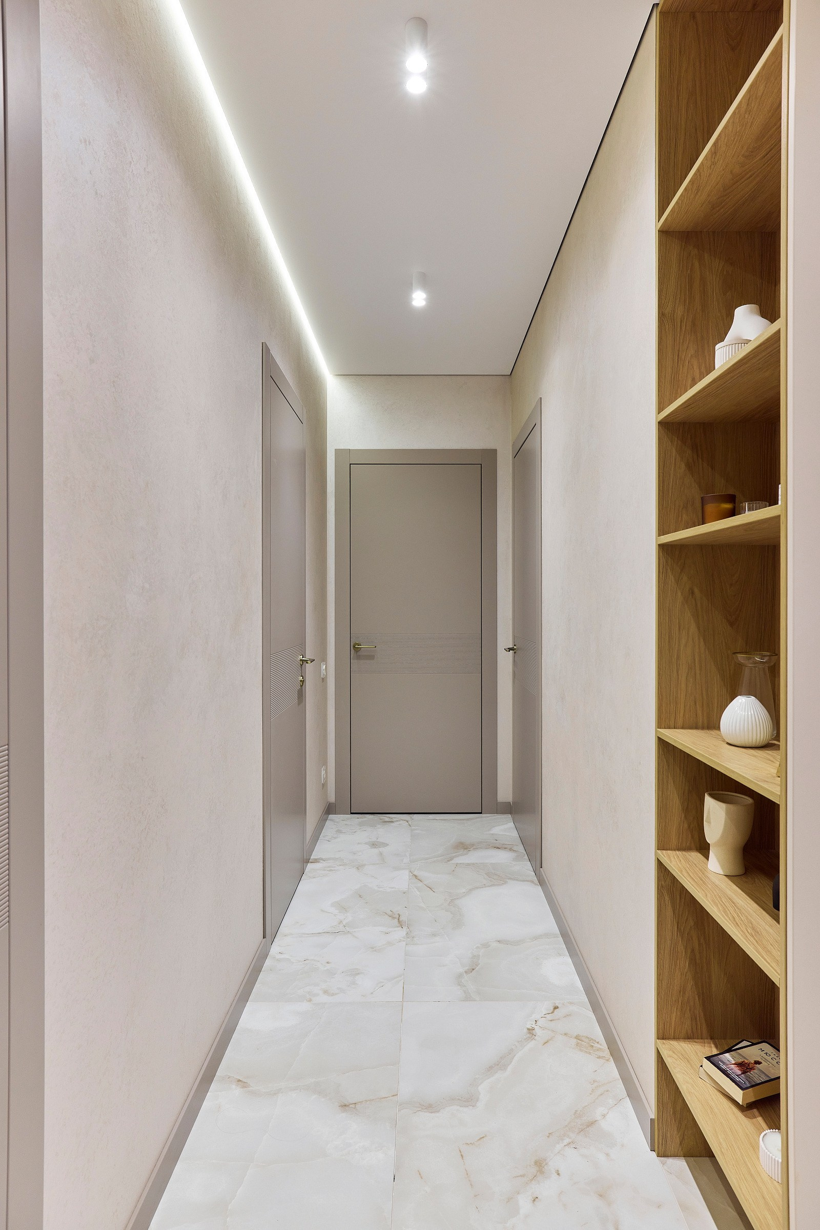 Монохромный интерьер с песчаными оттенками, спокойный и мягкий. Заказчица любит песчаные оттенки, природность цвета и плавность линий, спокойный и монохромный интерьер. Муж — рыбак и прислал фотографии реки, как того образа, который его вдохновляет. Я взял за основу образ песчаного берега, реки, каменного и землистого русла — идея течения дает образ смягченных форм, плавности, но при этом внутренней силы. Декор с морской тематикой, образы ракушки в керамике и панно, все детали отсылают к теме реки.