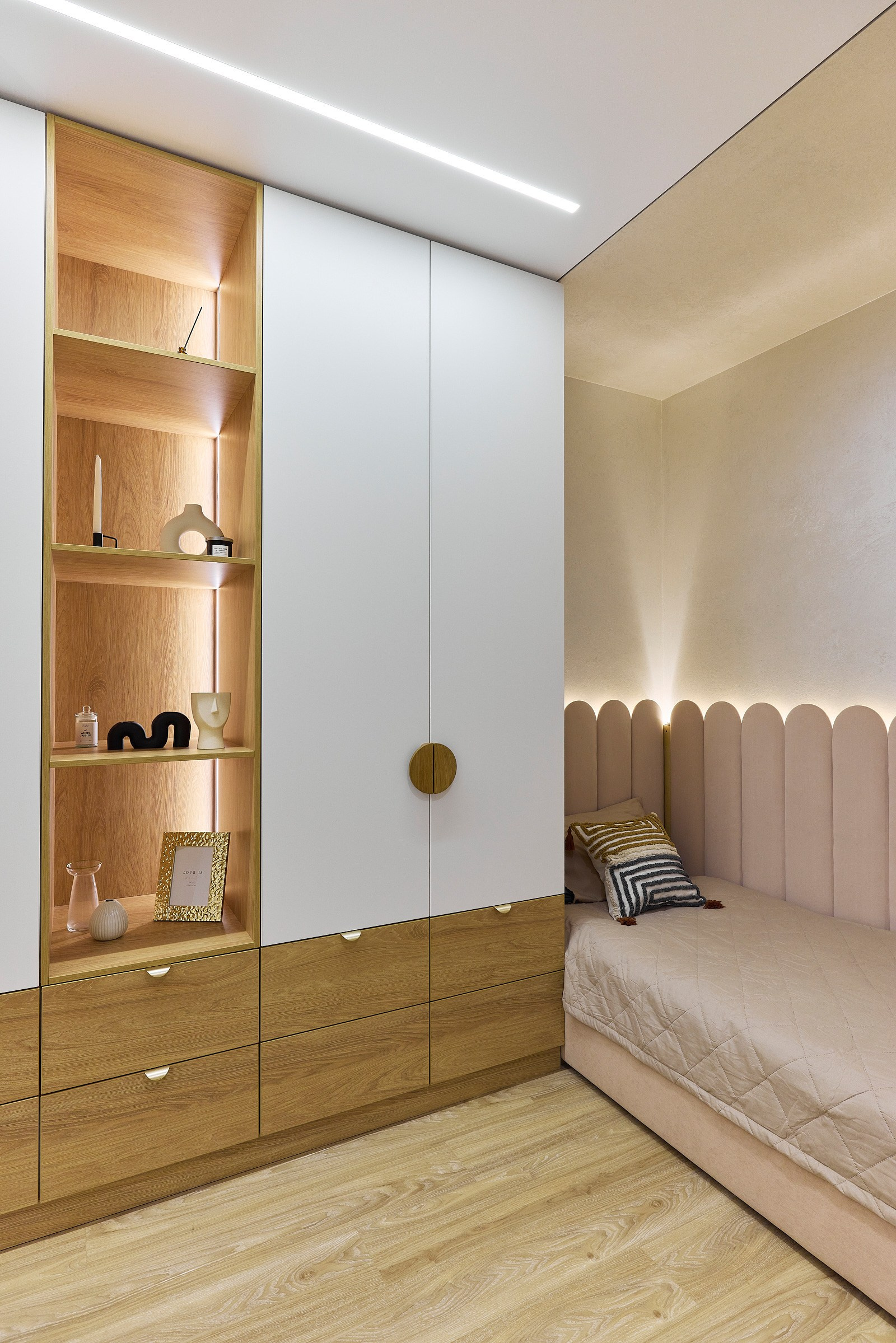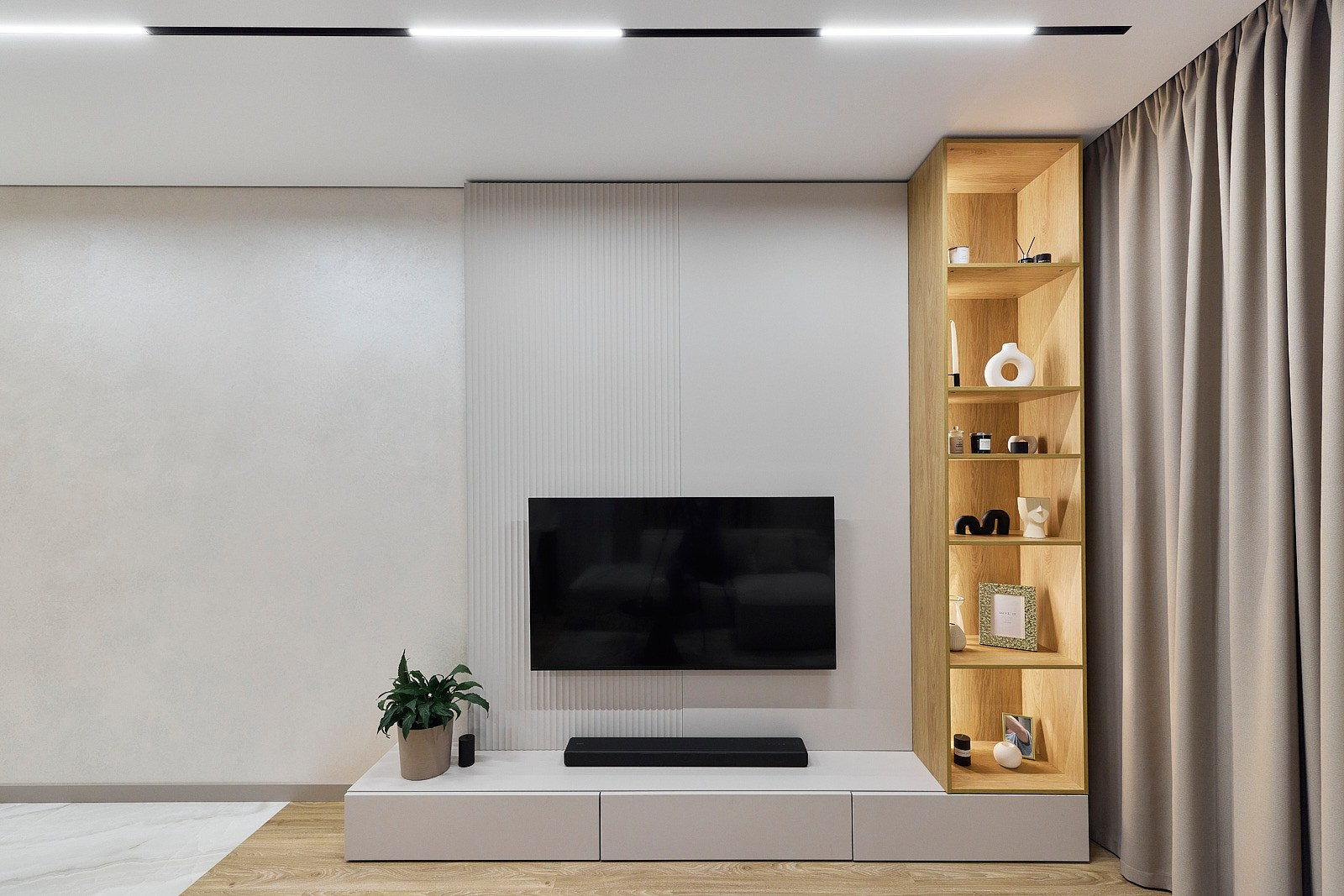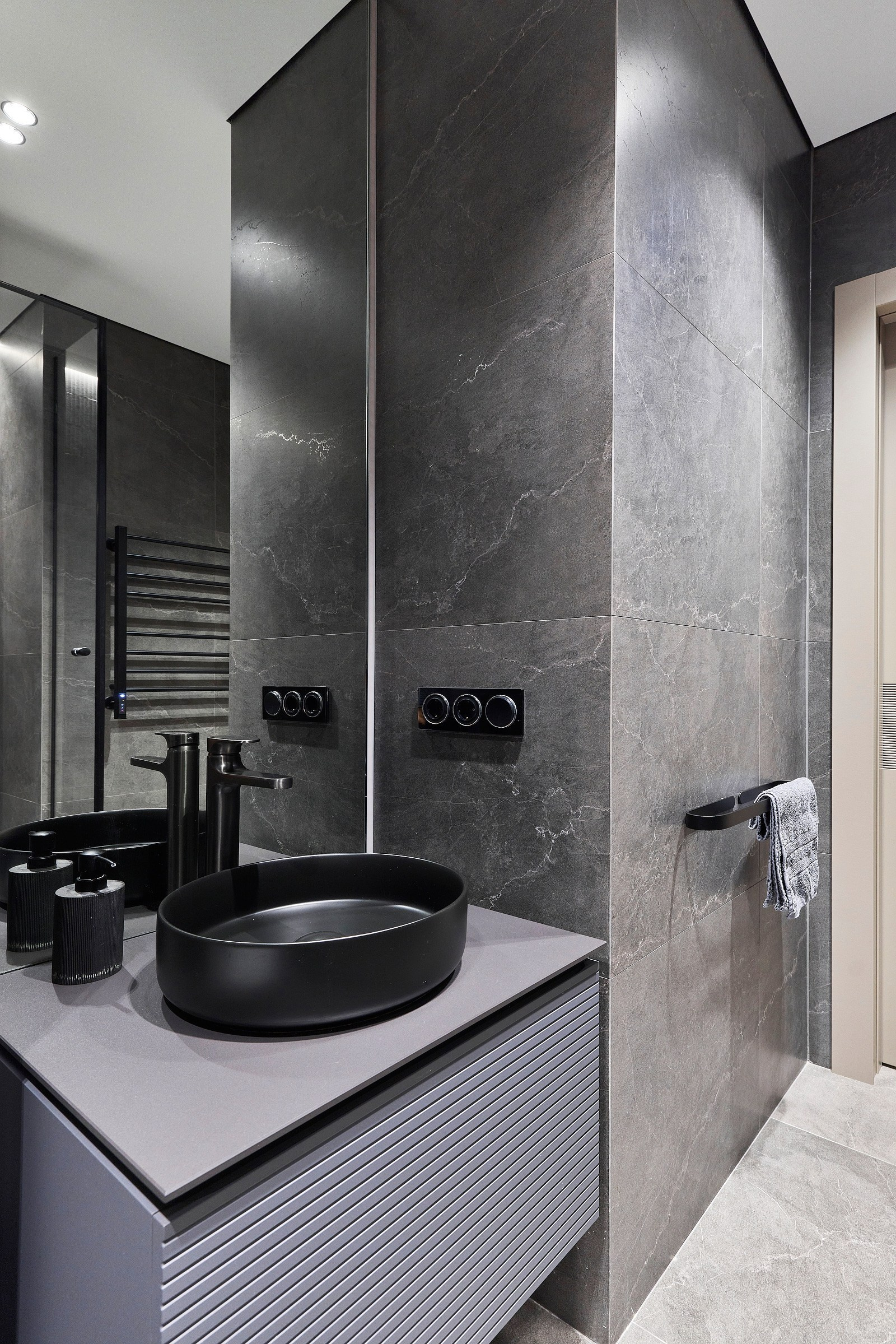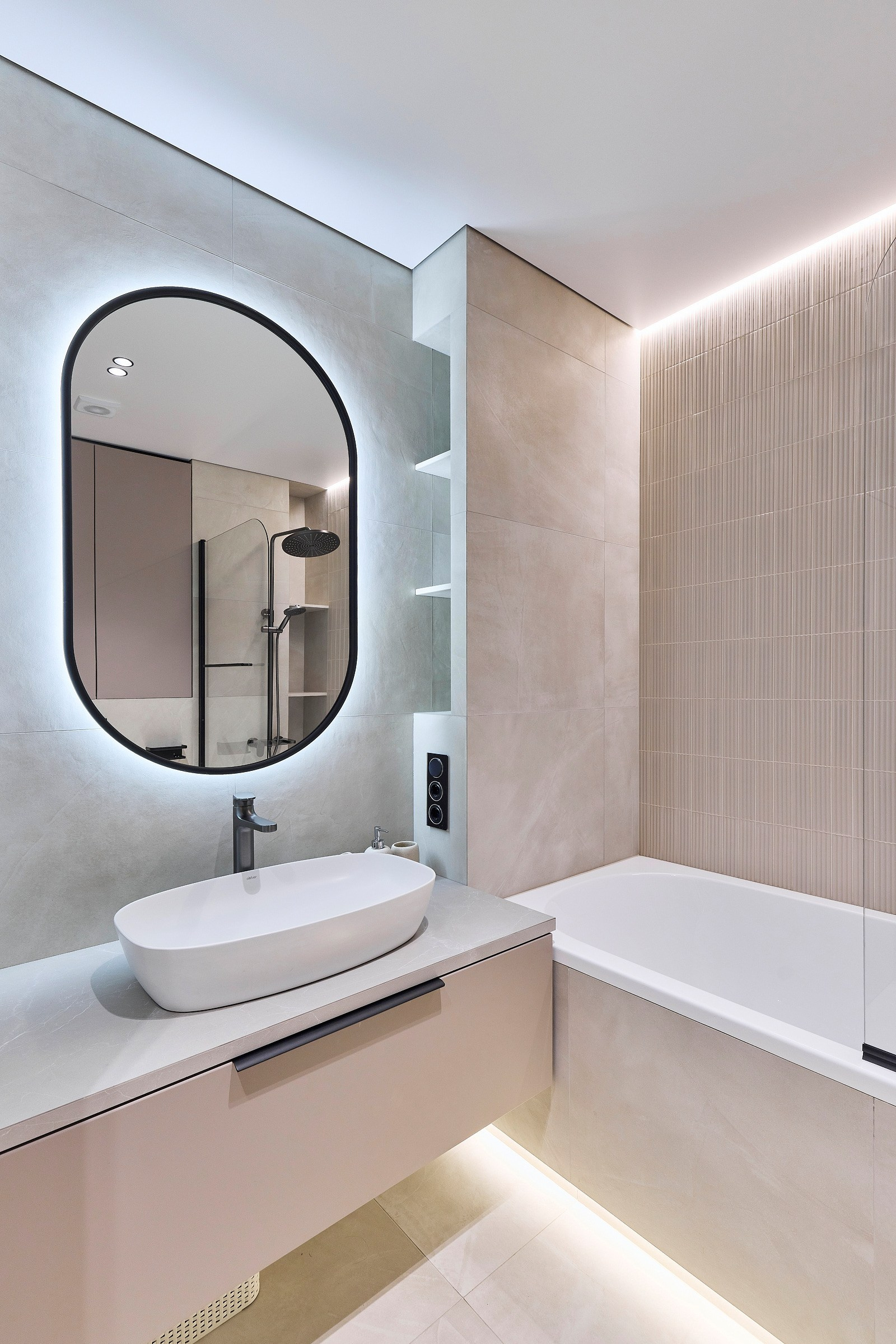 Монохромный интерьер с песчаными оттенками, спокойный и мягкий. Заказчица любит песчаные оттенки, природность цвета и плавность линий, спокойный и монохромный интерьер. Муж — рыбак и прислал фотографии реки, как того образа, который его вдохновляет. Я взял за основу образ песчаного берега, реки, каменного и землистого русла — идея течения дает образ смягченных форм, плавности, но при этом внутренней силы. Декор с морской тематикой, образы ракушки в керамике и панно, все детали отсылают к теме реки.