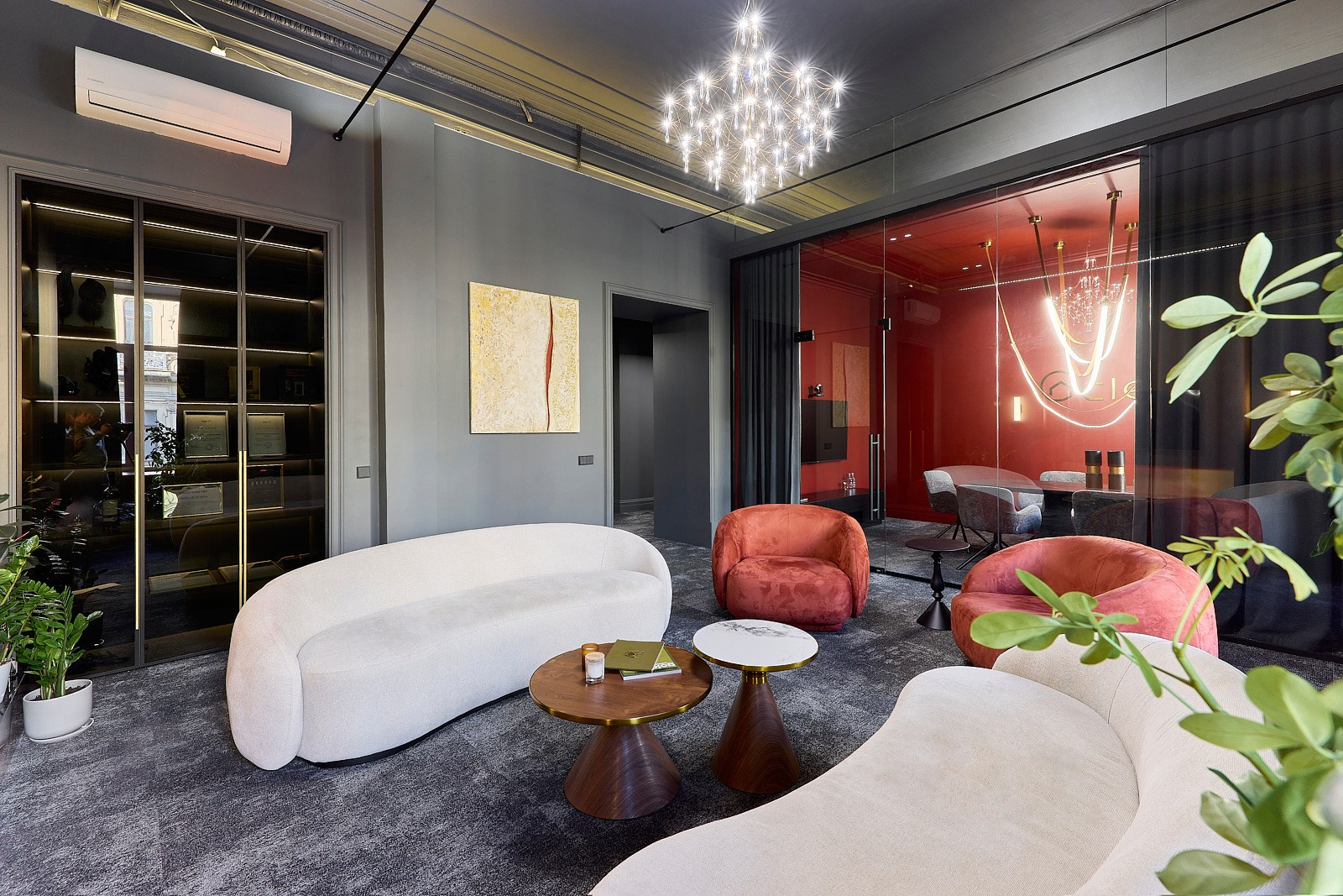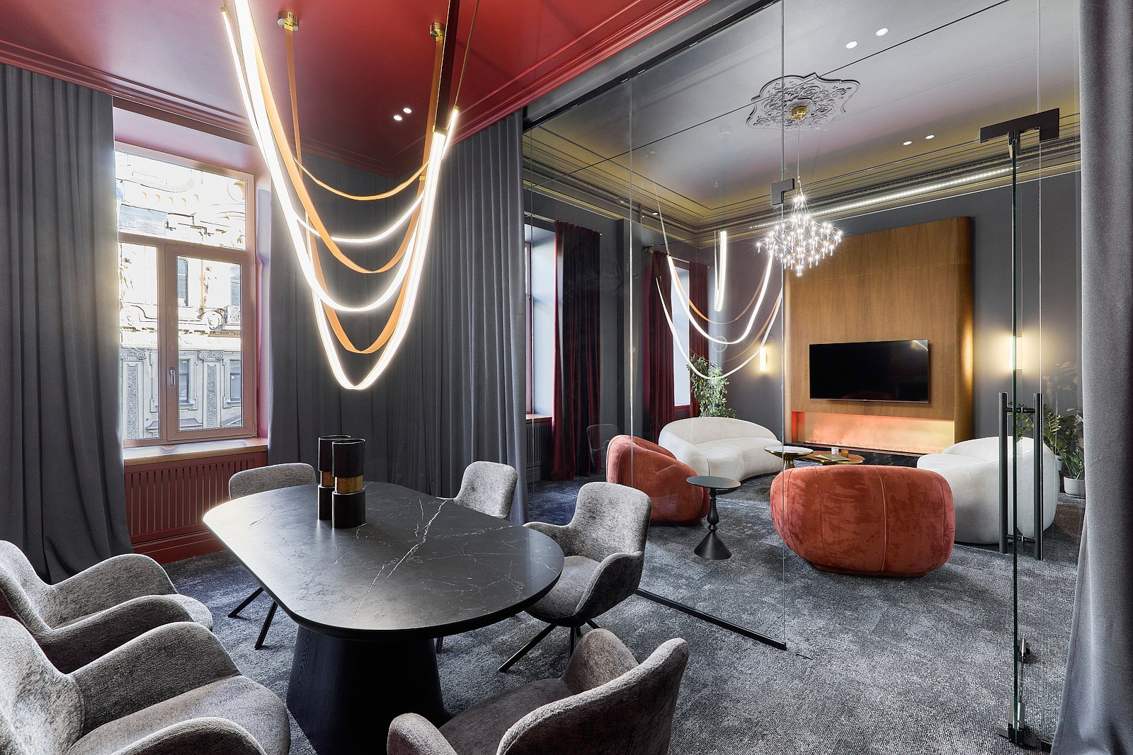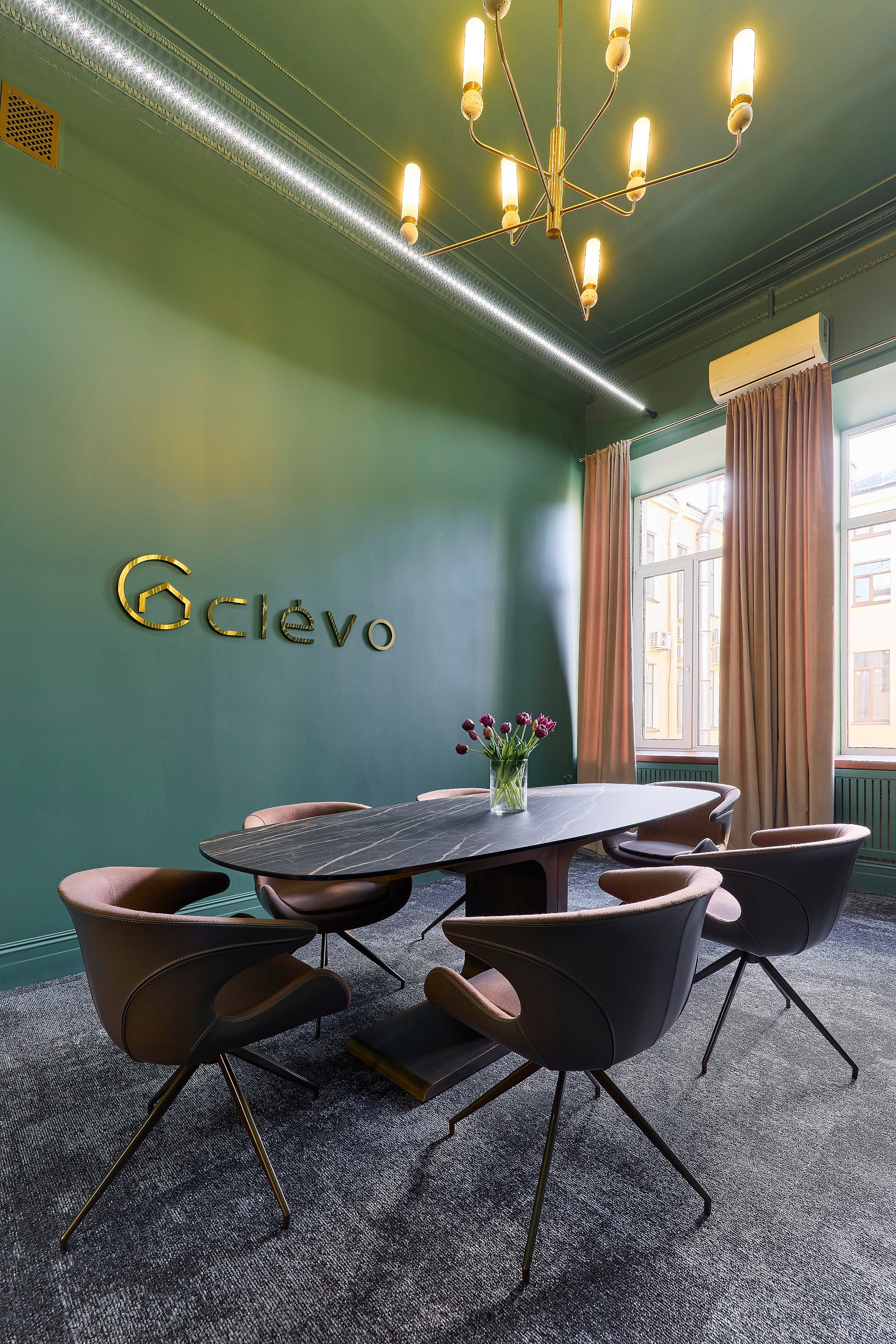 Задача заключалась в том, чтобы в короткие сроки создать стильный интерьер, способный подчеркнуть статус компании и её философию доверия. Под подвесным потолком были найдены фрагменты лепнины, которые легли в основу концепции. Их максимально сохранили, вернув пространству характер и глубину.
